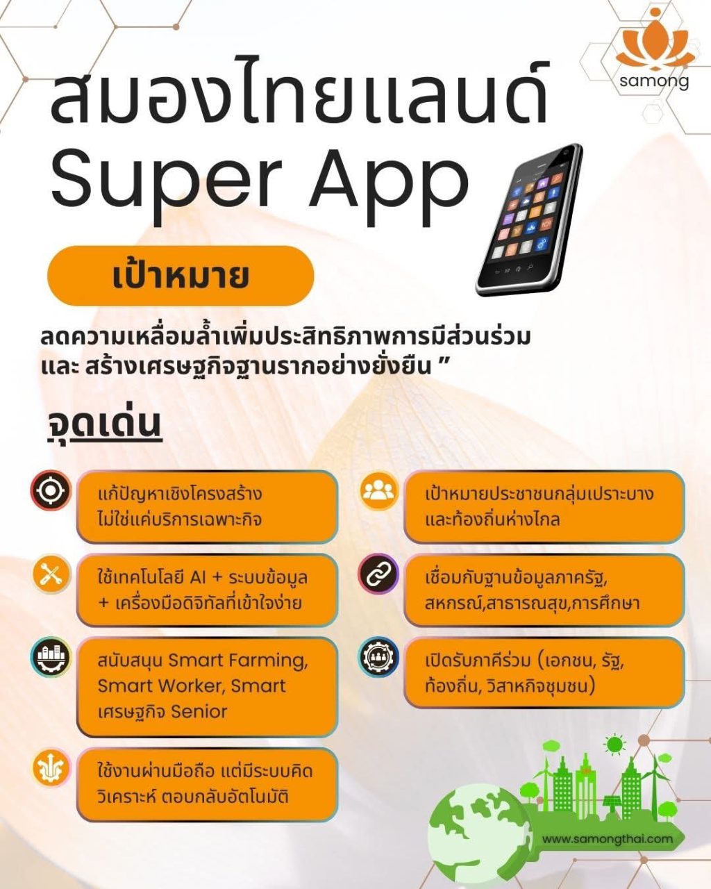 “สมองไทยแลนด์ (SamongThailand Super App): ทางรอดสำหรับสังคมไทย” 🧠 เมื่อสังคมไทยกำลังเผชิญความเปราะบาง… ในช่วงไม่กี่ปีที่ผ่านมา สังคมไทยต้องเผชิญกับความท้าทายหลายด้าน ทั้งวิกฤตเศรษฐกิจหลังโควิด ความเหลื่อมล้ำที่ถ่างกว้างขึ้น ความเสี่ยงจากภัยธรรมชาติ และการเปลี่ยนแปลงโครงสร้างประชากรที่เข้าสู่สังคมสูงวัยอย่างรวดเร็ว ในขณะที่เครื่องมือดิจิทัลที่มีอยู่กลับยังไม่สามารถเข้าถึง “คนตัวเล็ก” ได้อย่างแท้จริง จากสถานการณ์เช่นนี้ จึงเกิดคำถามใหญ่ขึ้นว่า “ประเทศไทยควรมีโครงสร้างพื้นฐานดิจิทัลที่ ทุกคน ใช้ได้จริงหรือไม่?” และคำตอบก็คือ “ใช่”นั่นคือที่มาของแนวคิด “สมองไทยแลนด์” (SamongThailand Super App) 📱 SamongThailand คืออะไร? SamongThailand เป็น Super App สัญชาติไทยที่ถูกออกแบบภายใต้แนวคิด “ไม่ใช่แอปเพื่อความสะดวกในชีวิตประจำวันเท่านั้น แต่เป็น เครื่องมืออยู่รอด ของประชาชนในทุกวิกฤต” ระบบนี้รวมฟังก์ชันหลากหลายเข้าด้วยกัน ตั้งแต่: โดยทุกอย่างถูกร้อยเรียงเป็น “โครงสร้างดิจิทัล” เพื่อช่วยให้ประชาชนใช้ชีวิตได้อย่างมั่นคงในยุคที่โลกเปลี่ยนอย่างรวดเร็ว 🔍 ทำไมจึงเป็น “ทางรอด” ของสังคมไทย? 1. 👩‍🌾 เข้าถึงกลุ่มเปราะบางได้จริง ขณะที่แอปส่วนใหญ่เน้นกลุ่มกลางเมือง SamongThailand กลับเริ่มต้นจากชุมชนเกษตรกร ผู้สูงอายุ…